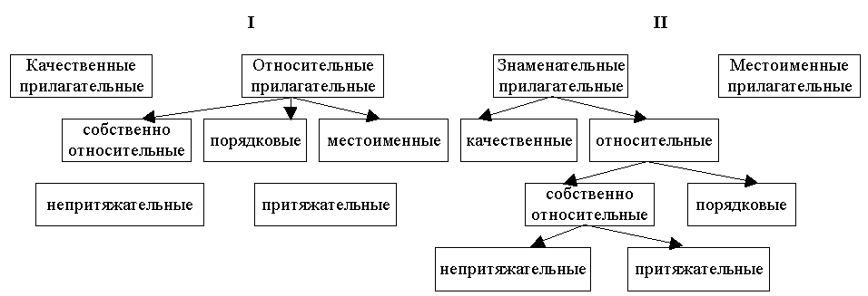 Классификация по первому признаку разделяет прилагательные на два лексико-грамматических разряда – на прилагательные качественные и относительные. В состав относительных прилагательных входят собственно относительные (притяжательные, см. § 1296, и непритяжательные), порядковые и местоименные прилагательные. Классификация по второму признаку разделяет прилагательные на знаменательные и местоименные. К знаменательным прилагательным относятся все качественные прилагательные и все относительные, кроме местоименных.